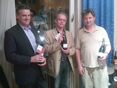 Obmann Klaus Thalhammer (re) ehrt den ASK-Klubmeister 2012, Markus Zauchner (li) Die 3 bestplatzierten der ASK-Schnellschachmeisterschaft 2012: Platz 3 Gerhard Böhm (re), Platz 2 Alessandro Misciasci (mi) und Platz 1 Robert Scheiblmaier (re).