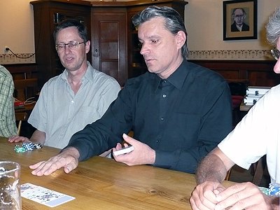 | Der 6. ASK Schach-Poker-Meister Fred Forstinger (li) gegen den späteren Turnierdritten Walter Hattinger. | Heli Flatz gegen Poker-Turnierleiter Anatol Lederer (re). |
