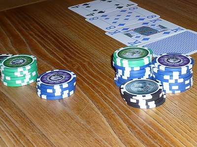 | Als Dealer stellte sich dankenswerter Weise Gerhard Böhm zur Verfügung. | Die Chips wechselten schon zu Beginn des Turniers rasch die Besitzer. |