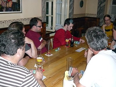 Anschließend ging es dann mit Auto oder Rad zum Pokertisch in den Ganshof. Einige non-gambler zog es mit und diese genossen einige Schachpartien im Gastgarten. Inzwischen wurden im cardroom am table die Plätze zugelost und die Pokerspieler mit den Schachpunkten entsprechenden Chip-Stößen vom Turnierleiter Anatol ausgestattet. Als dealer stellte sich dankenswerter Weise Böhm Gerhard zur Verfügung.