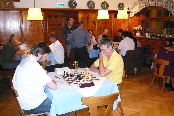 Diesmal ließ sich Trainer Thalhammer etwas Besonderes einfallen: In Simulation einer realen Endspielsituation mussten 2 Spieler mit etwa gleicher ELO-Stärke mit jeweils begrenzter Zeit auf der Schachuhr und mit Schreibzwang eine dynmische, ausgeglichene Endspielstellung spielen. Anschließend wurde gemeinsam analysiert. In der 2. Trainingseinheit wurden dann noch Endspielstellungen aus tatsächlich gespielten Partien gemeinsam diskutiert.