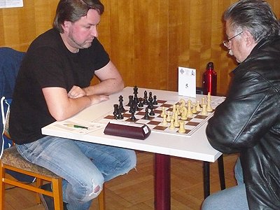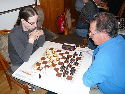 Die vielleicht am heißesten umkämpfte Partie fand auf Brett 3 statt. In der Eröffnung spielte Klaus Thalhammer gegen Harald Hicker eine Variante, in der er einen Bauern für eine initiativere Stellung opferte. Leider verpuffte die Initiative aber rasch und Klaus verblieb mit einem Minusbauern. Als sich der Mannschaftsführer bereits Sorgen über den Ausgang der Partie zu machen begann, wickelte Klaus die Partie noch souverän in ein Endspiel ab, das für Harald Hicker nicht mehr zu gewinnen war: Im Spiel der ungleichfarbigen Läufer opferte Klaus zuerst seinen Läufer gegen den starken Freibauern und einen weiteren Bauern, um dem Gegner Doppelrandbauern zu bescheren, die nicht mehr (rechtzeitig) einziehen konnten.
