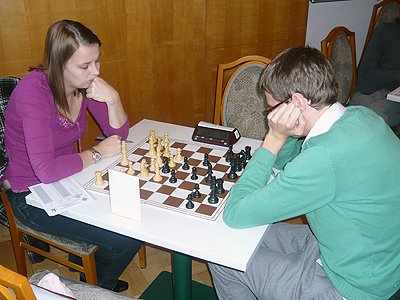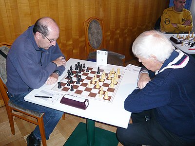 Auch Teamkollege Gernot Neuwirth hatte gegen Franz Luksch einmal mehr mit Zeitnot zu kämpfen. Im Unterschied zu Anatols Partie wurde auf Brett 5 aber um einiges ruhiger gespielt. Beide Spieler bauten sich beinahe symmetrisch auf, lange Zeit versuchten beide ihre Figuren ideal hinter den sich direkt gegenüberstehenden Bauern zu positionieren. Schließlich kam es doch zur Öffnung des Spiels, wobei es Neuwirth nach einer Abwicklung gelang, dem Gegner einen Isolani „anzuhängen“. Zum möglichen Angriff auf diesen kam es aber nicht mehr, weil Gernot in Zeitnot seinem Gegner Remis bot, das dieser annahm.