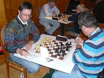Die vielleicht am heißesten umkämpfte Partie fand auf Brett 3 statt. In der Eröffnung spielte Klaus Thalhammer gegen Harald Hicker eine Variante, in der er einen Bauern für eine initiativere Stellung opferte. Leider verpuffte die Initiative aber rasch und Klaus verblieb mit einem Minusbauern. Als sich der Mannschaftsführer bereits Sorgen über den Ausgang der Partie zu machen begann, wickelte Klaus die Partie noch souverän in ein Endspiel ab, das für Harald Hicker nicht mehr zu gewinnen war: Im Spiel der ungleichfarbigen Läufer opferte Klaus zuerst seinen Läufer gegen den starken Freibauern und einen weiteren Bauern, um dem Gegner Doppelrandbauern zu bescheren, die nicht mehr (rechtzeitig) einziehen konnten.