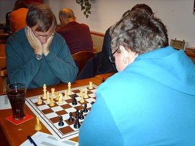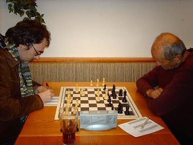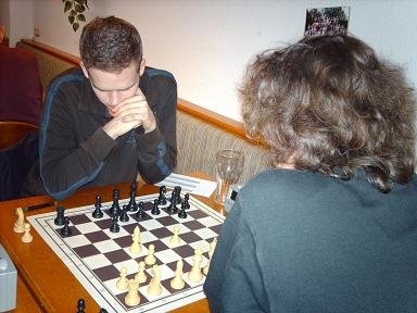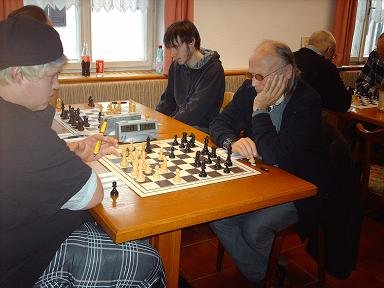 Mit einigem zeitlichen Abstand zu den schon beendeten Partie verloren auf Brett 3 Mende und auf Brett 4 Maringer ihre Partien. Bei der Partie von Mende wurde nur zögerlich abgetauscht und war fast das gesamte Spielbrett von oben her gesehen im rautenförmigen Muster mit Figuren besetzt.