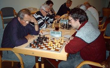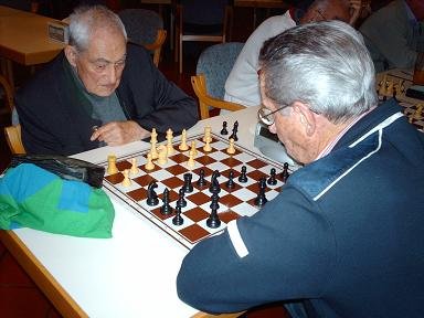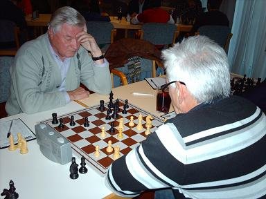 Auf Brett 3 zwischen Ablinger und Pacher gab es eine Besonderheit, auf die der Obmann von Salzburg Süd hinwies – nachdem schon einleitend neben der Begrüßung einige Details zum Thema Schach und Handy näher erläutert wurden: Nachdem beide Spieler über 80 Jahre sind, besteht beiderseits kein Schreibzwang mehr, was dann durch mitschreibende Assistenten bewerkstelligt wird. Mangels solcher wurde jedoch ohne Mitschrift gespielt. Ablinger führte die Partie mit gewohntem Einsatz gegen den ausgesprochen „Schwarz-Spezialisten“ Pacher (seine Siegesquote ist mit Schwarz wesentlich höher als mit Weiß). Am Ende musste Ablinger jedoch das Bauernendspiel aufgeben, da die Stellung gegen zwei Mehrbauern nicht zu halten war.
