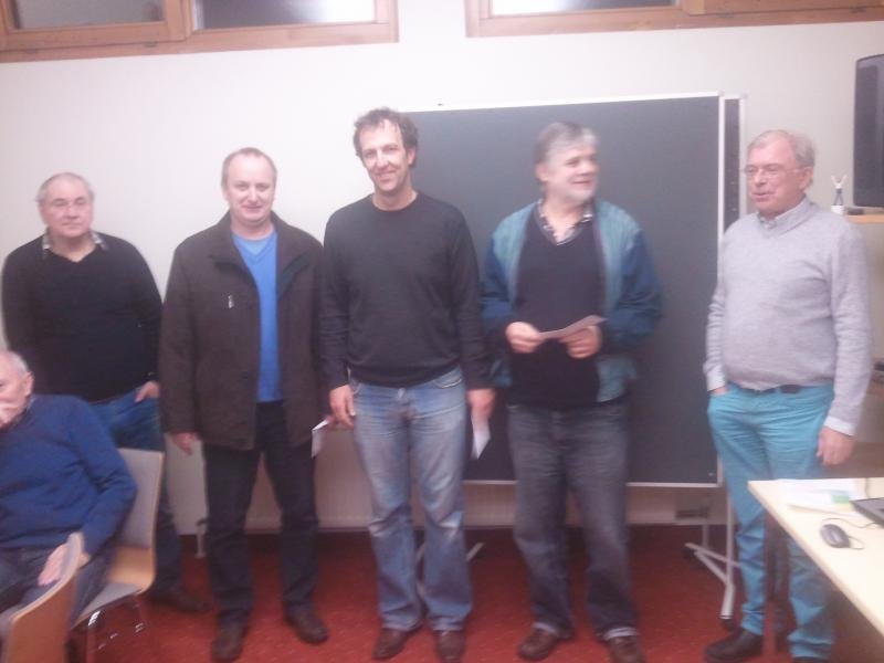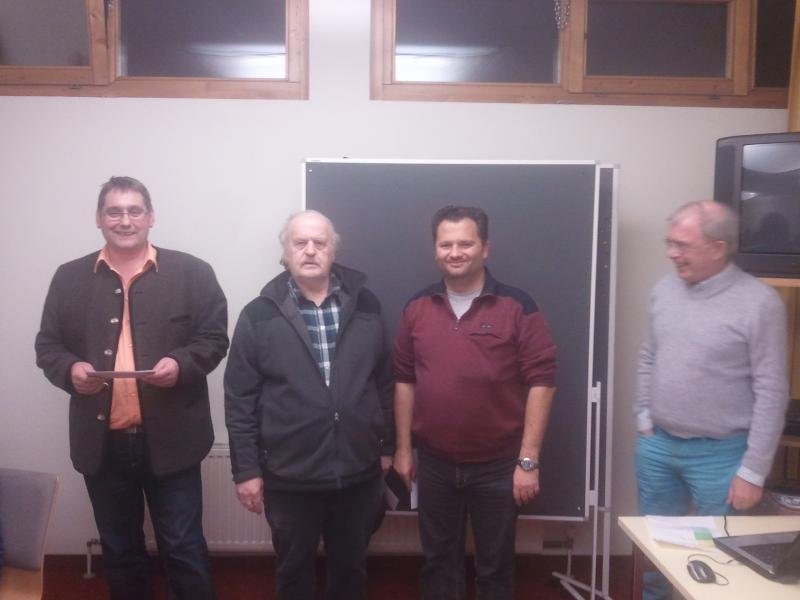| FM Engelbert Schöppl und Bernhard Besner (ex äquo Rang 3), Franz Harringer (Rang 1) und IM Vladimir Hresc (Rang 2). Rechts der Obmann des ASK und Turnierleiter Reinhard Vlasak |