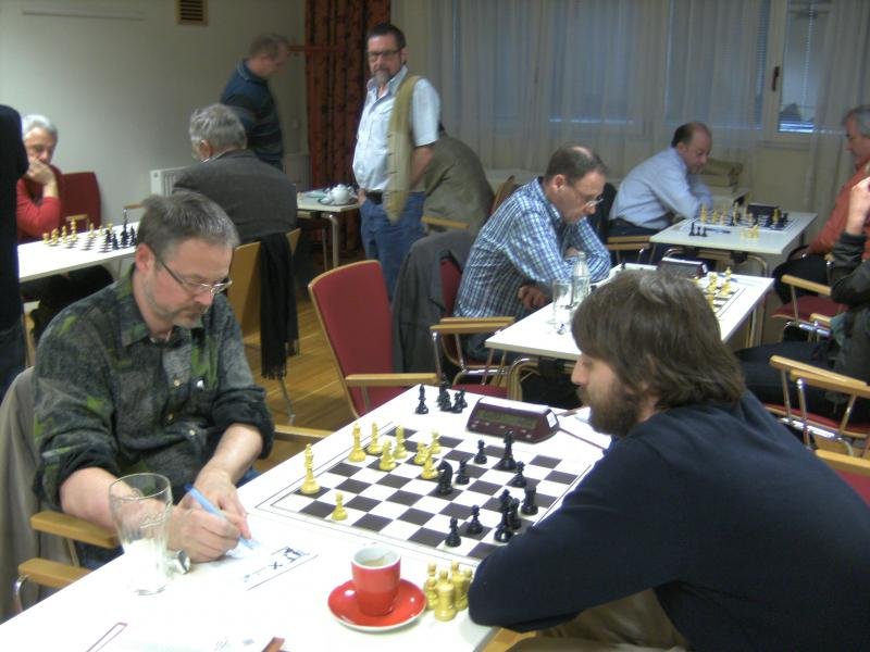 Dem raschen Sieg von Boris folgte ein ereignisloses Remis des Mannschaftsführers. Nach erbittertem Kampf musste Markus aufgeben, doch Wunder geschahen an den ersten Brettern: Wolfgang opferte gegen Helmut eine Figur in einer zweischneidigen Stellung, in beiderseitiger Zeitnot stellte er aber noch Haus und Hof ein. Noch schlimmer erwischte es Guido gegen Bernhard : trotz Plusdame(!) ließ er sich durch einen unvorsichtigen Turmzug gnadenlos auskontern… Der Sieg war erreicht, auch wenn Deszö eine erneute Niederlage einstecken musste. Fazit : es geht doch auch anders! (Bericht von Alessandro Misciasci)