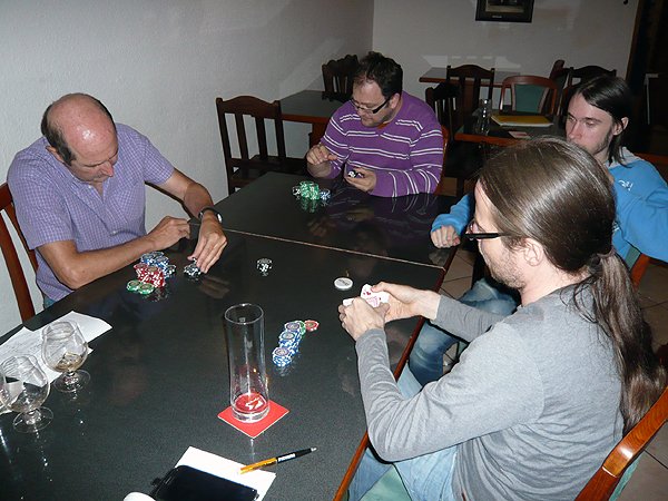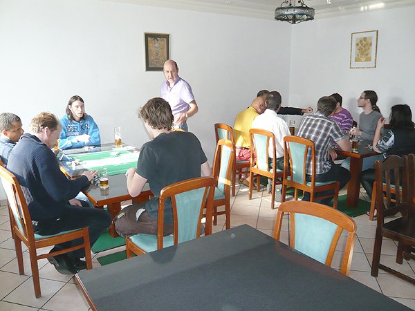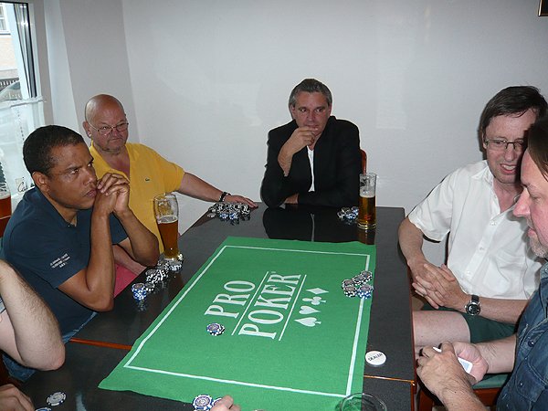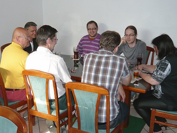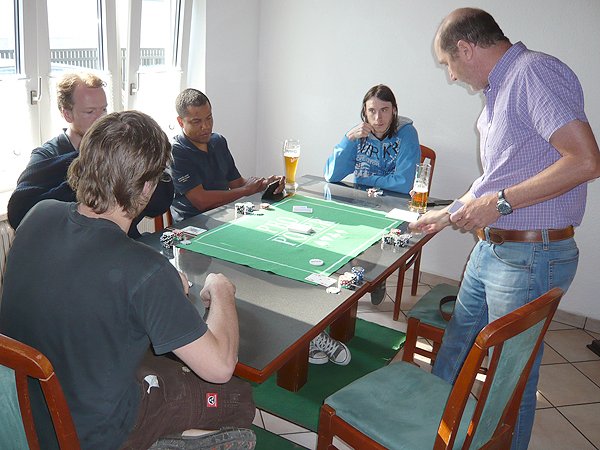 | Auf Tisch 2 spielten Gerhard, Stefan Heigerer, Anatol, Eva, Markus, Walter und Sepp. Die Regel: Von beiden Tischen bildeten die jeweils besten drei Spieler den „winner table“, die restlichen sieben Spieler spielten um den Sieg am „loser table“. |