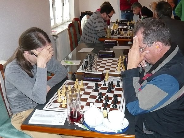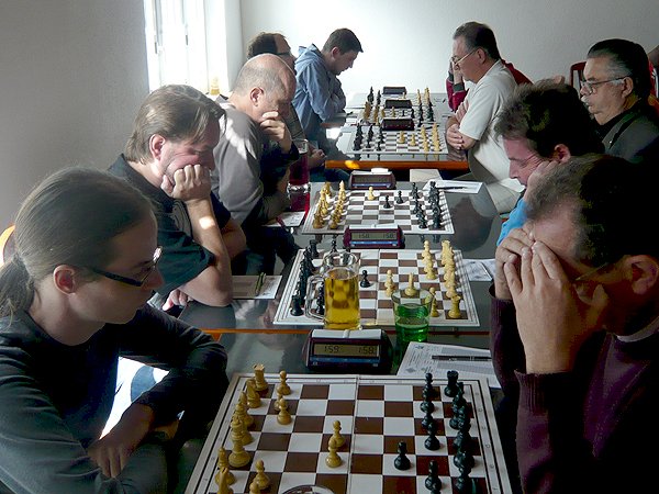 Den ersten halben Punkt bescherte uns Klaus. Er versuchte in einer unorthodoxen Eröffnung mit Weiß Vorteil zu erzielen, aber Franz verteidigte sich umsichtig und konnte die Stellung nicht nur ausgleichen, sondern auch leichten positionellen Vorteil erreichen. Aber Klaus setzte seinen Remis-Joker ein, der zwar kurzfristig abgelehnt wurde, aber in der geschlossenen Stellung in ein Remis-Endspiel abgewickelt hätte werden können und daher von Franz seinerseits Remis gegeben wurde.