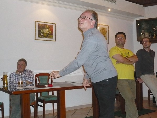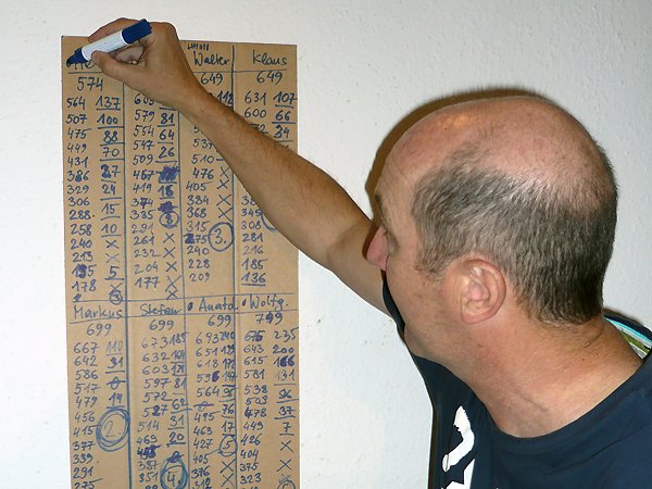 Helmut – er spielte vom niedrigsten Wert nach unten – blieb anfangs lange Zeit in Führung, aber die Verfolger Alessandro, Markus, Walter und Klaus näherten sich sukzessive. Auch Gernot konnte anfänglich Boden gutmachen. Die erwartete Aufholjagd vom bestens vorbereiteten Gerhard – er kam mit eigenen Pfeilen – blieb allerdings aus.
