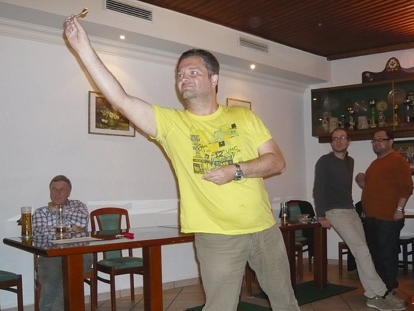 Als dann die magische Marke erreicht wurde, bei der man – nur mit DoubleOut – ausmachen konnte, zeigten fast alle Spieler Nerven. Nur Klaus, der das Turnier überdies umsichtig und mit nötiger Strenge leitete, holte wieder einmal seinen Wettkampfmodus hervor und beendete als Erster das Zittern mit einer Doppel-17. Markus und der vom eigenen Erfolg überraschte Walter belegten die Stockerlplätze. Dann finishten Stefan und Gerhard. Der mitfavorisierte Helmut und einige andere versuchten noch einige Runden lang „auszumachen“, bevor sie sich letztlich solidarisch auf „remis“ einigten und sich den gemeinsamen 6. Platz teilten. Darunter auch Eva, die sich als einzige Dame wacker hielt – im Unterschied zu ihren vielleicht etwas zu stumpfen Pfeilen, die leider oft von der Scheibe fielen.