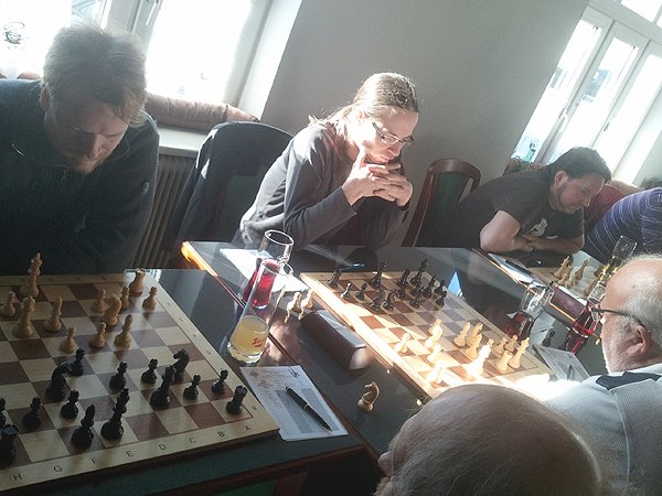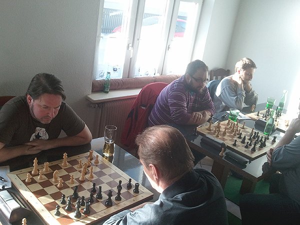Auf Brett 3 kam es zu einem frühen Remis zwischen Thalhammer Klaus (s) und Klinger Sepp. Beide konnten bei diesem Ergebnis das Gesicht wahren. Jedoch schien der Kampfgeist dabei noch nicht ganz befriedigt worden sein. So fand man sich noch in einigen Blitzpartien wieder, die mit dem einen oder anderen Bier auch leichter von der Hand gehen sollten.