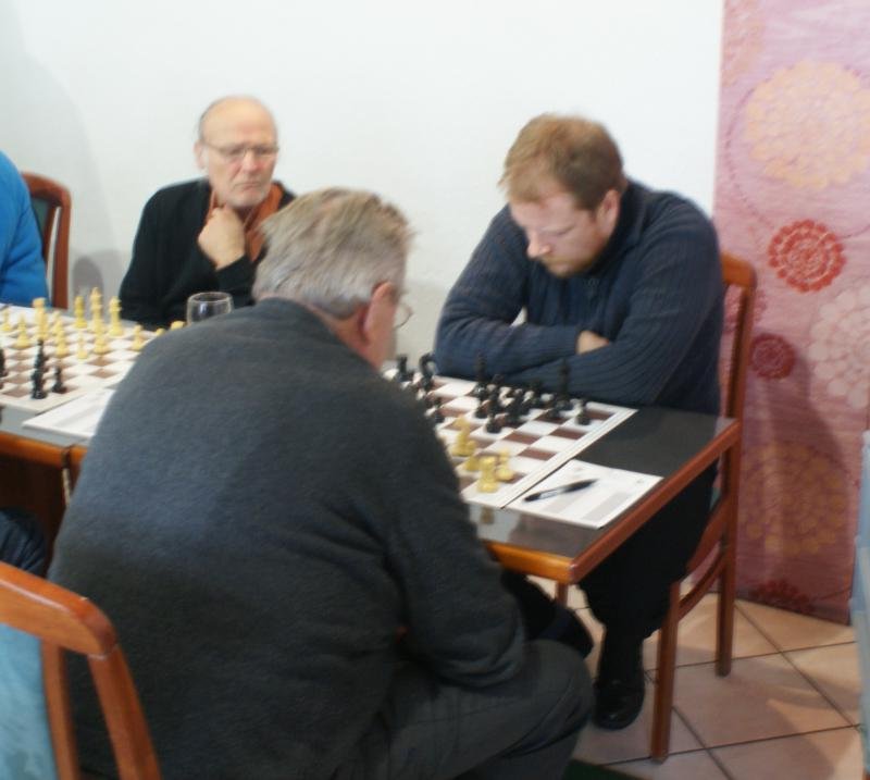 Auf Brett 1 kamen Stefan und Siegfried Schmidt ausgeglichen aus der Eröffnung. Siegfried ist ja nicht zu unterschätzen, wie ich letztes Jahr in der Schlussrunde mit einem mühevollen Remis zur Kenntnis nehmen musste.  Beide Spieler einigten sich rasch auf Remis – es sollte das einzige bleiben.