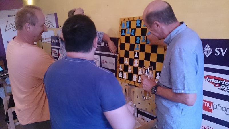 Vor der ersten Runde wurden mögliche Eröffnungen am Demo-Brett eifrig diskutiert.