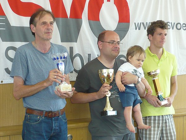 | Siegerfoto: FM Guido Kaspret wurde Dritter, CM Frank Fleischer (hier mit seinem Schachnachwuchs) Turniersieger und Emanuel Frank wie erwähnt Turnierzweiter. |