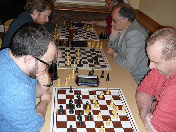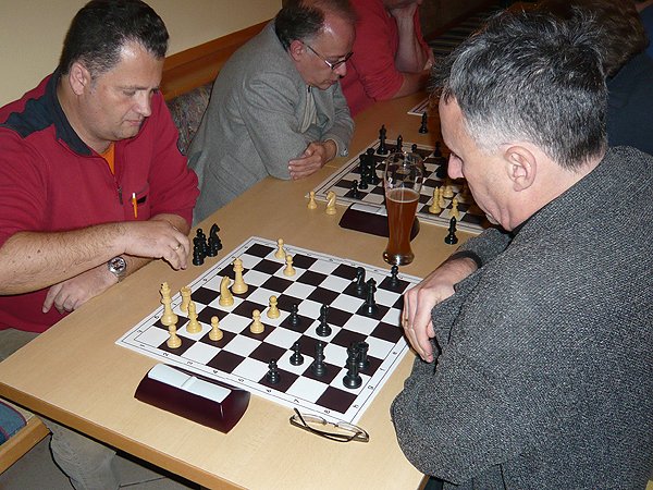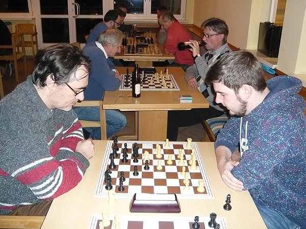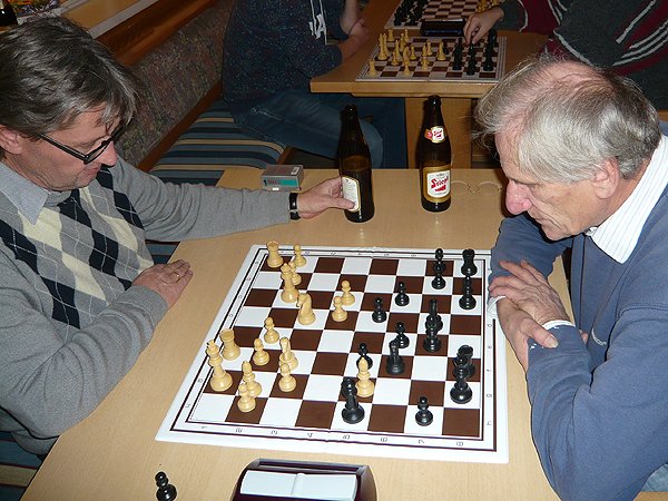 Aber auch VOR der Bar spielte es sich ab. Besonders freuten wir uns über einen seltenen Gast – Fernschachspieler Günther Bolda (Mitte). |