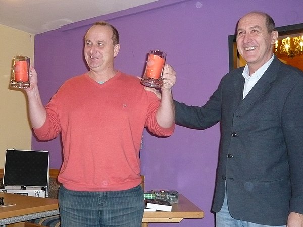 In der Pause des Blitzturniers nahm Spielleiter Klaus Thalhammer die Ehrungen vor. Einmal mehr bekam Bernhard Besner 2 weitere ASK-gravierte Krüge für den Gewinn des Sommer- und auch Wintercups. |