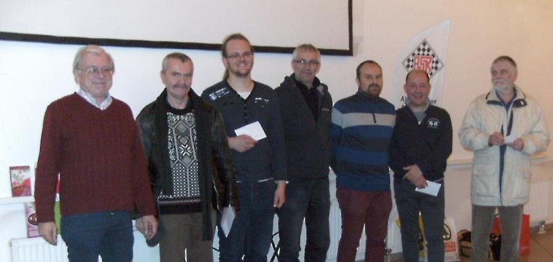 | Die Sieger des Dreikönigsturniers; von links Turnierleiter Reinhard Vlasak, Deszoe Tanczos (U-1850), Markus Friedl (U-1700), Vahidin Hamzic (U-2000), FM Alman Durakovic (Rang 3), Radoslav Panajotov (Rang 2) und Turniersieger IM Vladimir Hresc. |