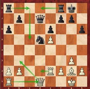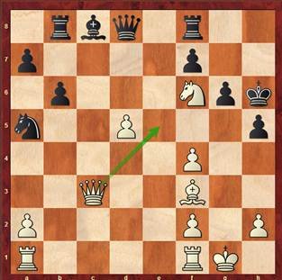 In dieser Stellung (Nach dem Schlagen meiner Dame mit 26. Dxc6) überlegte ich auch mit bc6 zurückzunehmen, um die Drohung Sf6 aufrechtzuerhalten und die Verdoppelung der Türme nach Sxc6 zu verhindern. Natürlich würde das meine Bauernstruktur entwerten. Nach Sxc6 rechnete ich mit 27. Td7. Bei tieferer Betrachtung, war ich aber beruhigt, da Tf7 wohl jede Gefahr ausschaltet. Und plötzlich sah ich eine teuflische Falle und spielte tatsächlich das harmlos wirkende 26. … Sxc6. Prompt spielte mein Gegner das erwartete 27. Td7 und sah wohl keine Schwierigkeit mehr, die Partie trotz knapper werdender Zeit ins Remis zuführen. Aber die Falle war schon zugeschnappt. Mit der Rückkehr des Springers 27. … Se5! war aber plötzlich nicht nur der Turm direkt angegriffen, sondern auch die Gabel auf f3 nicht mehr parier bar. Die Kompensation mit dem Bauern auf b7 war zu wenig. Ich führte die Partie sicher zum Sieg.