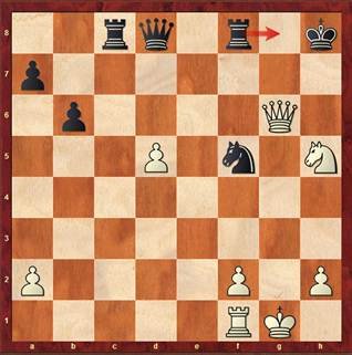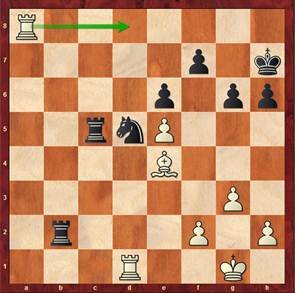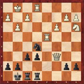 In dieser laut Computer ausgeglichen Position (Schwarz am Zug), hatte ich kein Gefühl mehr, wer besser stand. Zu verrückt waren die letzten Züge gewesen. Ich starrte nur mehr zwischen Uhr und Brett hin und her. Plötzlich sah ich das gewinnbringende Motiv 35. Txg6 gefolgt von Dxg6, wenn der Gegner im nächsten Zug nicht die 7. Reihe kontrollieren würde.