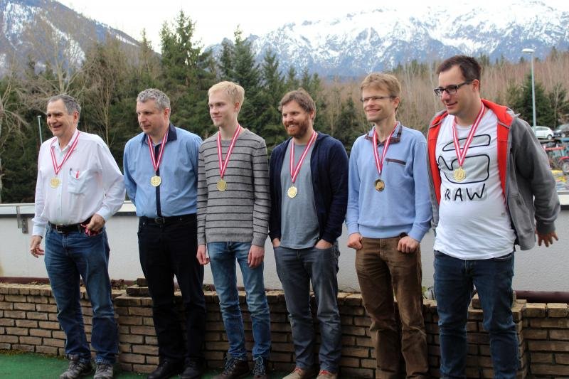 Das Team ASK 1: GM Egor Krivoborodov, Robert Scheiblmaier, Michael Herrmann, Bernhard Besner, Mannschaftsführer Heli Flatz und Klaus Jürgens. Nicht im Bild ist Emanuel Frank, der schon im Zug Richtung Wien saß.