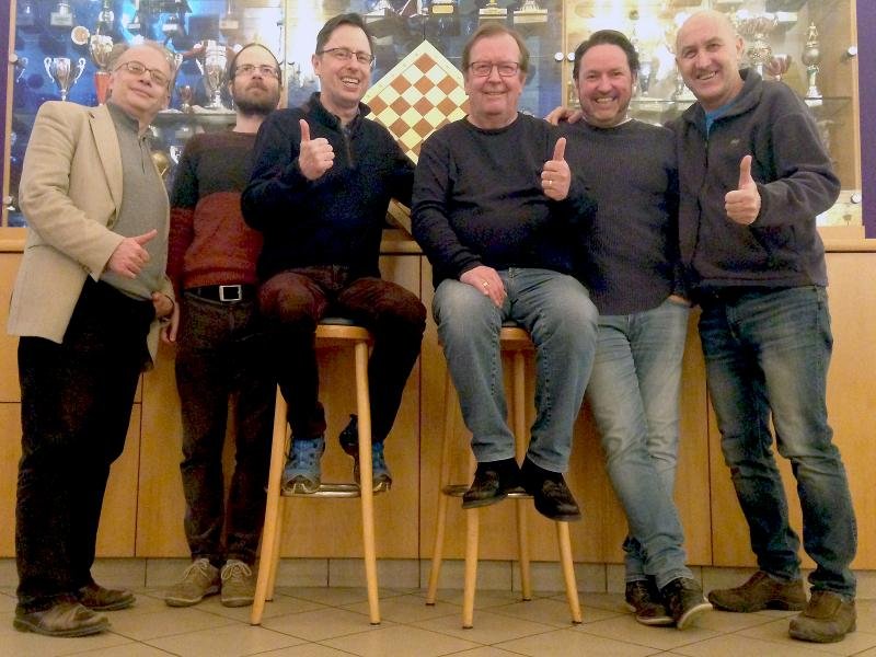 Aber dann gingen wir mit einem Sieg von Walter in Führung. Miro Stojakovic spielte die Eröffnung zu sorglos und sah sich plötzlich zwei Freibauern am Damenflügel gegenüber. Er konnte sie aber doch stoppen und mit verschiedenfarbigen Läufern und einem Gegenangriff schien die Partie dann zu kippen. Aber jetzt riskierte Walter alles und mit etwas Glück erreichte er dann ein gewonnenes Endspiel, das er souverän nach Hause spielte. Dann waren alle Augen auf die letzte Partie gerichtet, in der der Mannschaftsführer Klaus schon vor Beginn um ein Geschenk für das Geburtstagskind Manfred gebeten hatte. Aber Rosenlechner Gerhard machte dieses nicht. Manfred erreichte zwar in der Stellung mit geschlossenem Zentrum Raum- und Stellungsvorteil aber Gerhard verteidigte sich umsichtig, allerdings etwas passiv und lehnte sogar ein Friedensangebot ab. So konnte Manfred immer mehr Druck aufbauen und mit einem Turm in die Stellung eindringen. Wie aus dem Lehrbuch ließ er dann den Stellungsvorteil in einen Königsangriff übergehen. Den konnte Gerhard zwar gerade noch in Zeitnot über den 40. Zug verteidigen aber Manfred hatte weiter gerechnet. Nach einem Generalabtausch erreichte er ein praktisch gewonnenes Endspiel, das sich Gerhard dann nicht lange antat und Buchner Martin zu der Aussage veranlasste: „Ihr habt ja den besten Spieler ganz hinten aufgestellt.“