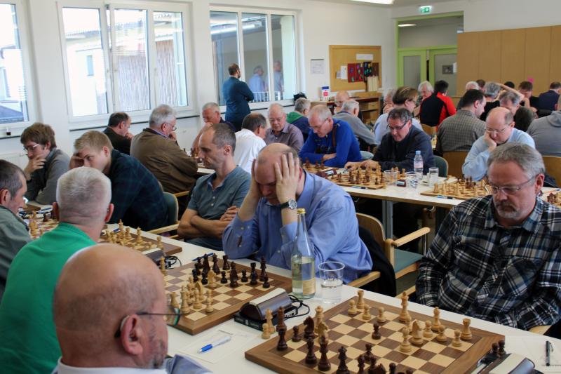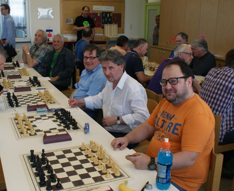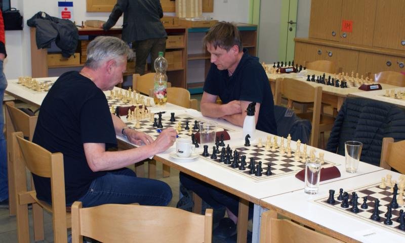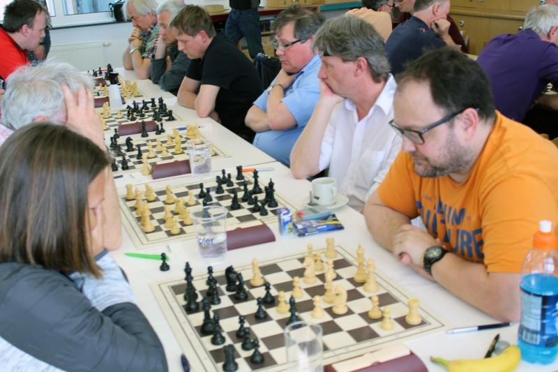 Sand im Getriebe:  Im weiteren Verlauf unterlief Christoph aber ein Versehen und er musste zwei Leichtfiguren gegen den Turm geben. Damit schien klar, das eine Remis schon ein optimales Ergebnis wäre, das nur schwer zu erreichen war. Robert Scheiblmeier, unser Edel-Joker auf Brett 5 fand gegen den Routinier Georg Maier keinen Gewinnweg. Bei schon knapper werdender Bedenkzeit bot er Remis, um nicht noch in Verlustgefahr zu kommen. Diese Situation nutzte Stefans Gegnerin Ortun, die einen der drei Bauern erobern konnte mit dem Remisangebot. Wie vorher vereinbart, sollten diese aber nur angenommen werden, wenn wirklich kaum Chancen auf Sieg bestand. Stefan sah zu recht aber Kompensation für seinen Bauern und spielte weiter. Dann passierte leider ein entsetzliches Malheur: Nach dem (vermeintlichen) 40. Zug von Stefan, beim Nachdenken über den 41. viel die Klappe. Ortrun reklamierte, und beim Nachspielen der Partie stellten die beiden fest, dass sie an unterschiedlichen Stellen einen Zug zu viel eingetragen hatten. Ein äußerst unglücklicher Verlust, der Stefan sichtlich am allermeisten ärgerte.  Damit Stand es plötzlich ausgeglichen, mit großer Verlustgefahr für Christoph in den verbleibenden Partien.