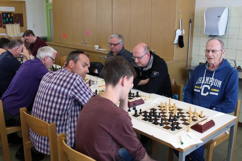 Guter Start: Es entwickelten sich überwiegend ausgeglichene Mittelspiele und in den ersten gut zwei Stunden war kaum ein Vorteil für mich erkennbar. Dann kam aber Bewegung in die Sache.  Helmut Usleber auf Brett 2 legte die Partie gegen Gerald Junger gewohnt zweischneidig an, mit Königen auf verschiedenen Seiten. Beide Kontrahenten griffen die gegnerische Königsstellung an, doch Helmuts Konzept erwies sich überzeugender. Er trieb den h-Bauern energisch voran, setzte mit einem nicht annehmbaren Springeropfer nach und zwang den Gegner dann bald zur Aufgabe. Zum Schluss also doch noch der verdiente Sieg von Helmut in einer für ihn schwierigen Saison. Er hatte sich ja bereit erklärt, als 5 gesetzter lt. Eloliste am schweren Brett 2 anzutreten.