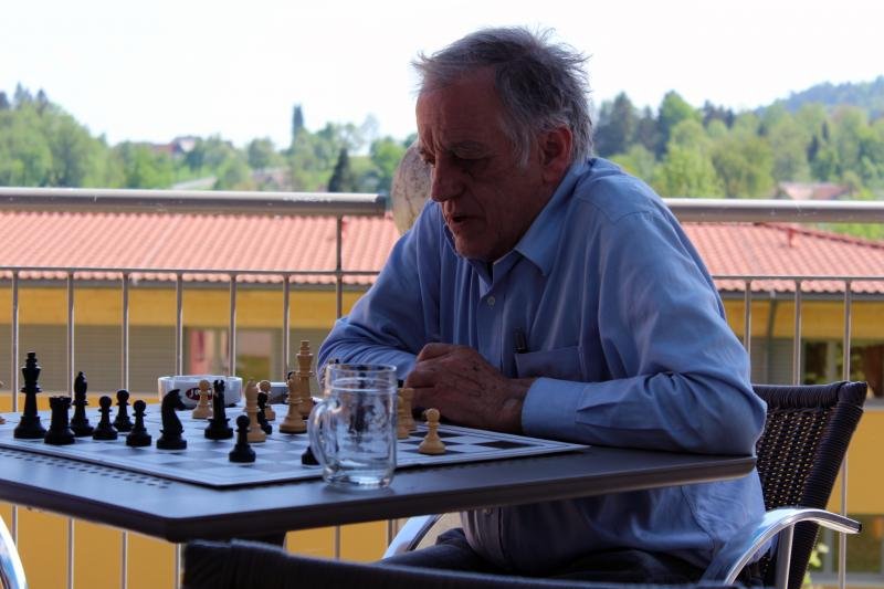 In der abschließenden 7. Runde wurde ich gegen Günter Höbart (1903) gelost. Für ihn war das Turnier eher durchwachsen verlaufen, und so verlief auch die Partie. Bis zum 20. Zug war nicht mal ein Bauer getauscht worden. Dann begann Günter, die Stellung zu öffnen. Es stellte sich rasch heraus, dass meine Figuren besser standen als seine. Eine kleine Ungenauigkeit von Günter endete in einem Figurengewinn für mich, wonach Günter aufgab.