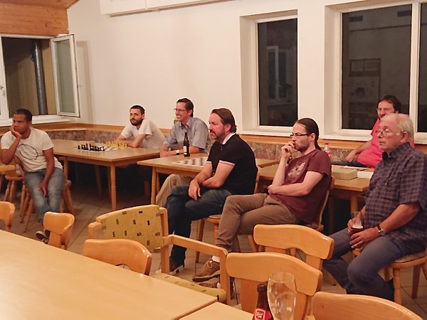 | Mittwoch, 29.08.2018, ca. 22 Uhr: Was verfolgen die Teilnehmer des ersten ASK Problemschachabends? O das Fussballspiel Red Bull Salzburg gg. Roter Stern Belgrad O ein Schachproblem |
