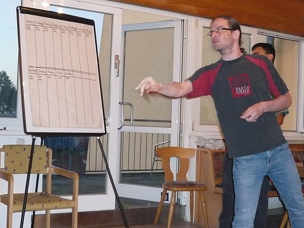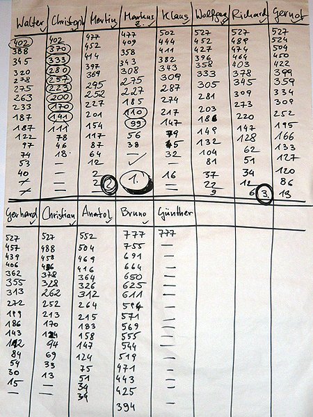 Von den 12 Teilnehmern gab es diesmal zahlreiche Favoriten, nachdem einige blitzstarke Spieler (Walter, Christoph, Richard) beim Schach am 05.09.2018 viele Punkte holten (siehe Zwischenbericht) und die Verfolger brav Darts trainiert hatten oder zumindest genug „Scheibenerfahrung“ mitbrachten (Klaus, Gerhard, Markus, Martin, Anatol). So kamen dann auch genug Spieler in den Finish-Bereich und damit die Möglichkeit mit einem gezielten (Glücks-)Wurf den Sieg zu erringen.