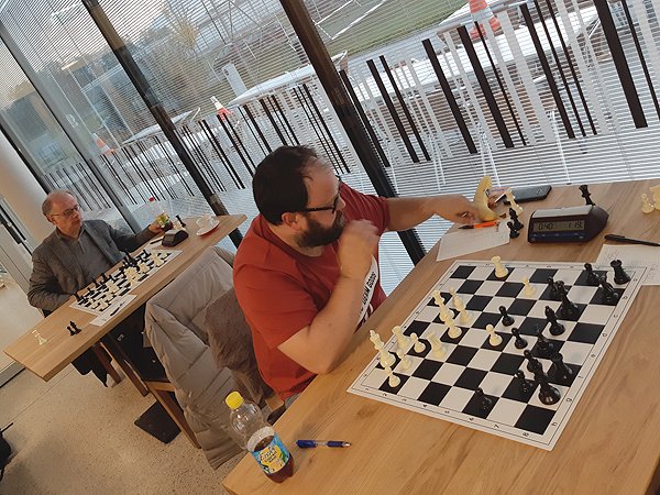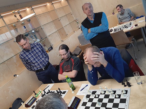 Eröffnungsphase: Stefan Heigerer brachte mit Weiß ein französisches Bauernopfer und erhielt dafür vielversprechenden Angriff. Brett 2: Alessandro Misciasci probierte eine ausgefallene Variante im Sizilianer, konnte ausgleichen, aber es waren alle Figuren am Brett und die Aufstellung war ihm selber auch unbekannt. Auf Brett 3 musste Markus Zauchner in einer unorthodoxen Eröffnung Lehrgeld zahlen und konnte nur mit Mühe die Stellung halten. Allerdings kostete es beiden extrem viel Zeit. Anatol Lederer rauschte gegen Klinger Sepp in seine Haus-und Hof-Eröffnung, in der er ganz komisch stand, aber auch der König von Sepp irrte mitten im Feld herum. Dann wurde es vogelwild. Auf den hinteren Brettern fielen die ersten Entscheidungen: Walter Hattinger konnte schnell ausgleichen und musste dafür nur einen positionellen Nachteil am Damenflügel in Kauf nehmen. Das Gegenspiel auf einen vergifteten Bauern von Bernatovic Anton schätzte er leider falsch ein und verlor nach einer schönen Falle. Gott sei Dank konnte postwendend Walter Krimbacher in geschlossener Stellung gegen Ljubic Franjo Jun. den Gleichstand herstellen. Er lavierte so lange, bis Franjo einen entscheidenden Fehler machte.