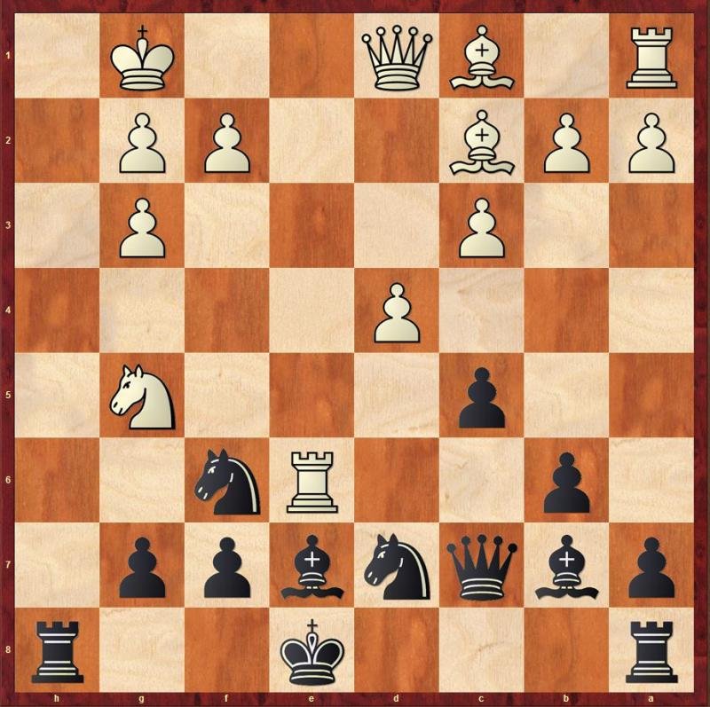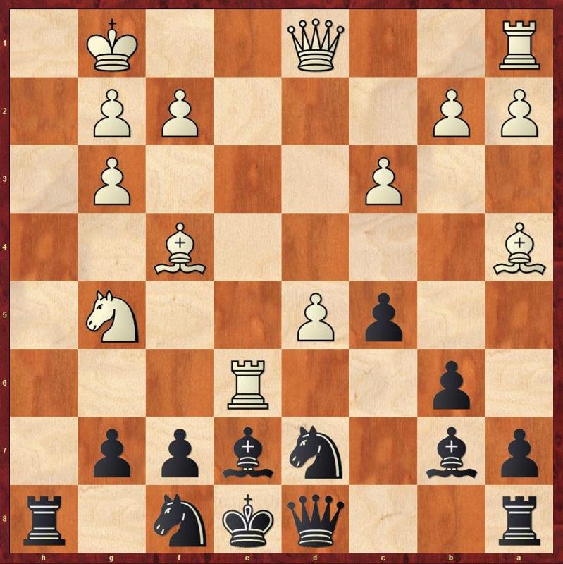 Variante:  das von den Engines empfohlene 16 Txe7 ist für das menschliche Auge wohl kaum zu finden – es folgt Kxe7 17 Lf4 Dd8 18 Db3 Se6 19 Te1 Th6 20 Ld6+ Kxd6 und die Gabel mit Sxf7+