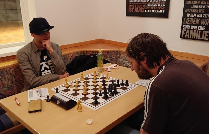 Brett 2: Leitner Bernhard wollte gegen Baumgartinger Gerald nicht zu viel riskieren und erreichte nach Damentausch eine komplett ausgeglichene Stellung. Angesichts der guten Stellungen an den anderen Brettern willigte Bernhard ins Remis ein.