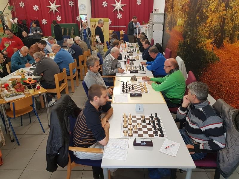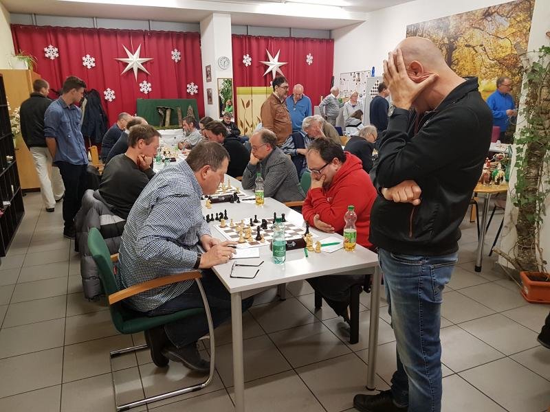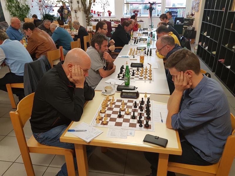 Als erster musste Klaus Thalhammer auf Brett 6 Federn lassen. Diesmal stellte sich der Kapitän selbst auf und spielte auch gleich aggressiv mit Weiß gegen Esterbauer Andreas, der sich nach einigen Eröffnungsungenauigkeiten von beiden Seiten auf eine heterogene Rochadestellung einließ. Die Attacke von Klaus begann jedoch mit einem Fehlzug, den Andreas mit einer „kleinen Kombination“ konterte. Darauf verlor Klaus die Nerven, spielte einen Verlustzug ( Bewertung Fritz -3,5) bot aber im Mannschaftssinne gleichzeitig Remis an. Hier half Klaus vielleicht der noch bestehende Elounterschied und Andreas nahm an, ohne den Wiederlegungszug zu suchen.