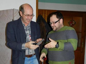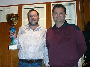 Der (Darts-)Bulleye-Gewinner Thomas Böhm mit dem Preisstifter und SLV Fernschachreferenten Helmut Flatz (links). |
