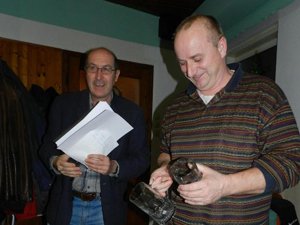 Christoph Löffler und Bernhard Besner holen sich vom Gabentisch ihre Geschenke. |
