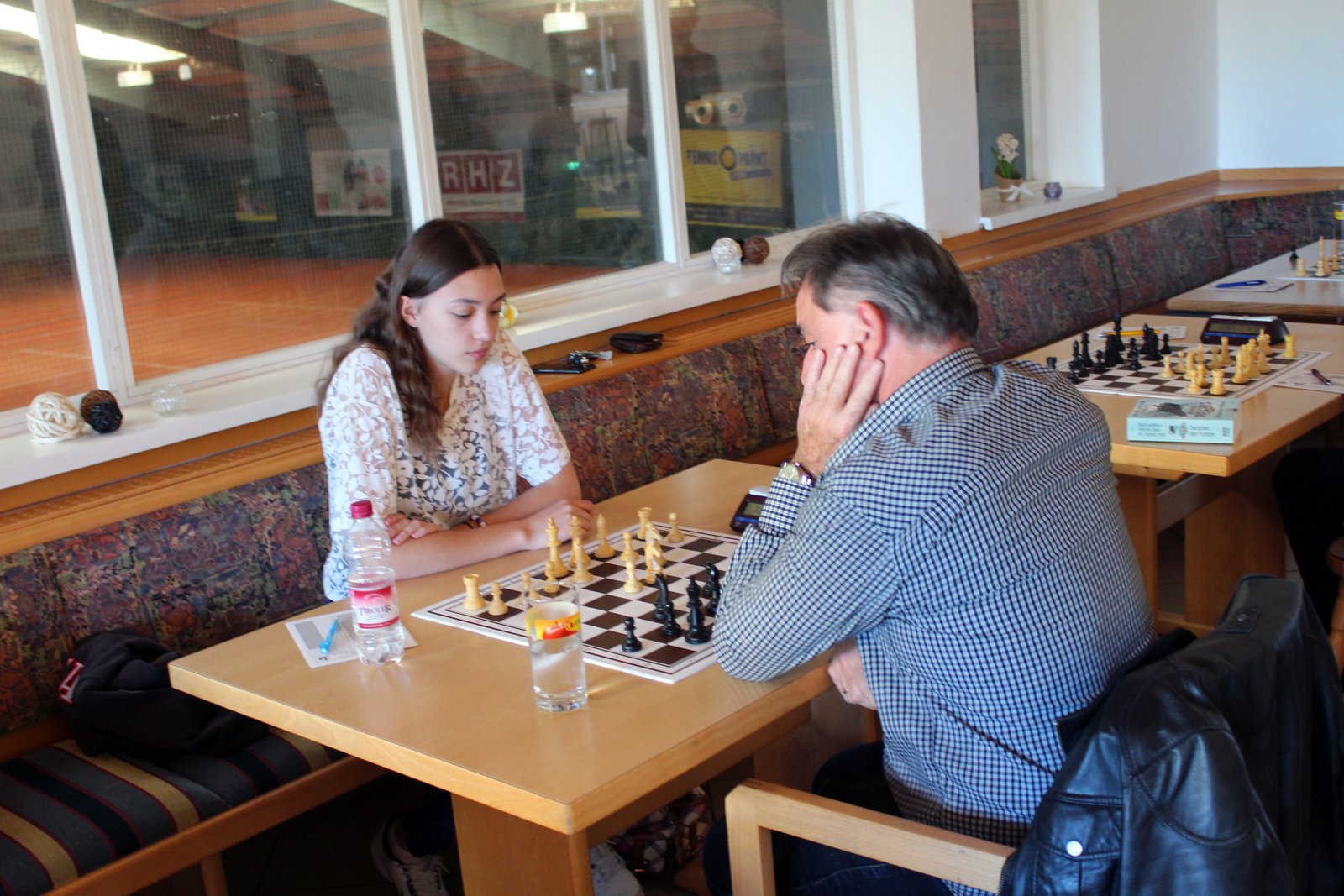 Nun zur längsten Partie des Tages: Miriam Mörwald gegen Ernst Putz (1721). Sie kam richtig gut aus der Eröffnung, Schwarz spielte etwas unorthodox. Davon ließ sich Miriam aber nicht beeindrucken und baute ihren Positionsvorteil weiter aus, auch der König auf h7 gab eine Zielscheibe ab. Schwarz entschloss sich zum Qualitätsopfer, was aber nichts einbrachte. Das zweite Opfer war nur noch Verzweifluung, am Ende hatte Miriam 2 Qualitäten mehr und eine sichere Königsstellung, der Sieg war damit perfekt.