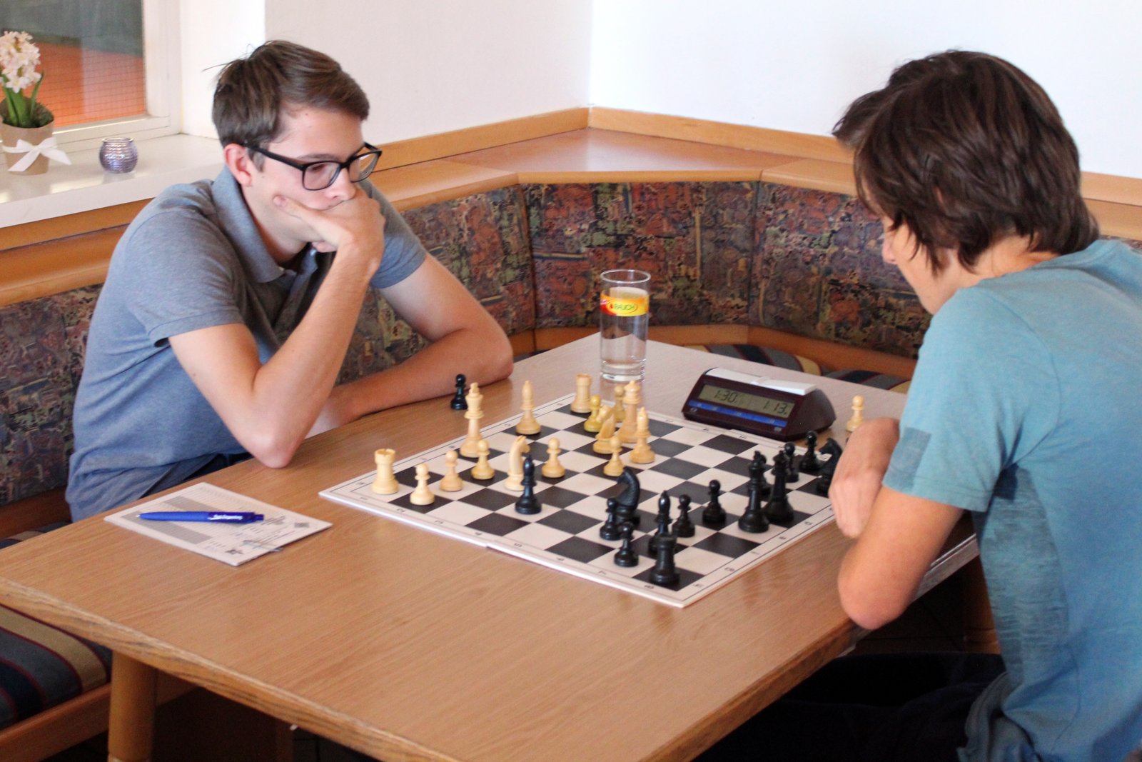 Brett 4 Anton Wenger – Neuwirth: Gernot musste an diesem Nachmittag zwei Dinge akzeptieren, die ihm im Schach gar nicht gefallen: Eine Eröffnung, die er nicht kennt, und ein Gegner, der mit allen Mitteln ein Remis erzwingen möchte. Zwar lehnte er Remisangebote im 9. und 23. Zug noch ab, aber das ständige Berechnen von Durchbruchs- und Opfermöglichkeiten um doch noch einen Gewinn zu erzwingen verschlang so viel Zeit, dass er schließlich in Zeitnot doch eine dreimalige Zugwiederholung akzeptieren musste. Im Nachhinein gesehen war es wohl ein strategischer Fehler, die Damen früh zu tauschen wenn man auf Gewinn spielen möchte!
