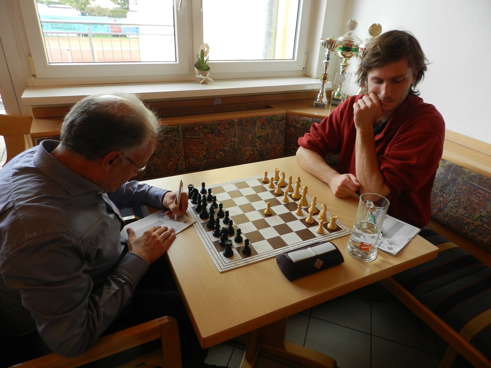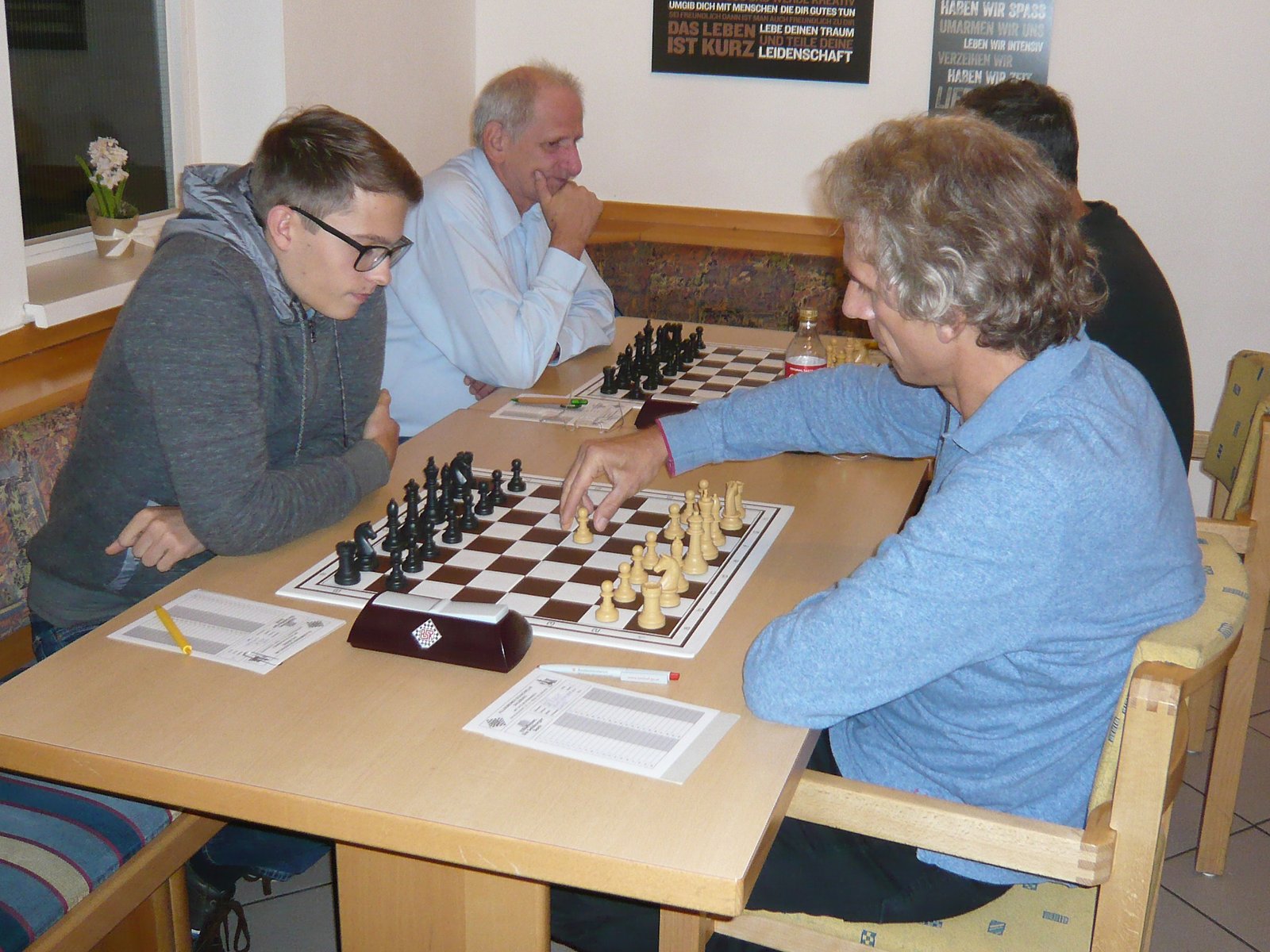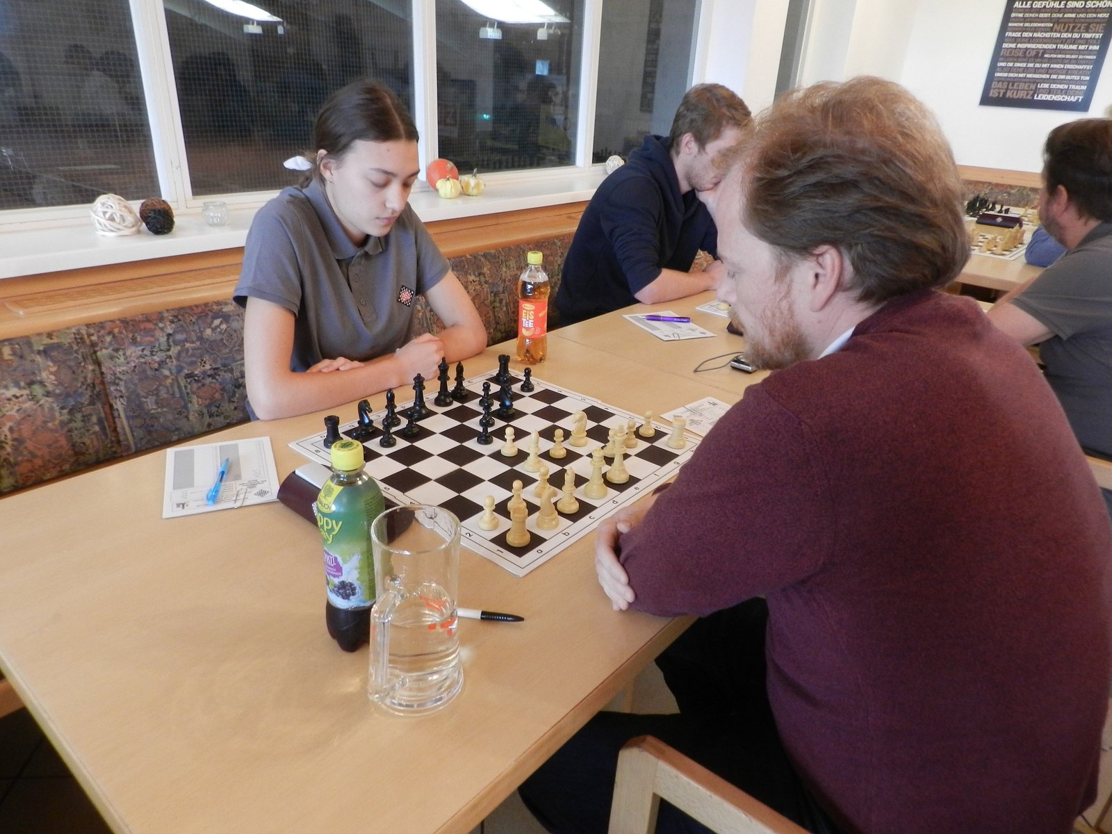 Diese Partie fand unter etwas traurigen Umständen statt, wie sich aber erst später herausstellen sollte. Zum sportlichen ist nicht viel zu sagen. Lukas behandelte die Stellung deutlich besser als ich und ließ eine Kombination vom Stapel, die ihm eine Qualität einbachte und nebenbei die Damen verschwinden ließ. Ich rechnete mir bereits nichts mehr aus als Lukas nach jedem Zug für 10 Minuten verschwand. Zunächst dachte ich mir nichts dabei, doch als Klaus dann zu mir kam und mir ein Remisangebot von Lukas zutrug, da er sich mehrmals übergeben musste, wusste ich was los war. Wir brachen die Partie ab und gaben remis, Lukas hätte die Partie sicher gewonnen. Das waren also die tragischen Umstände dieser Partie. Hoffen wir, dass es Lukas bald besser geht.