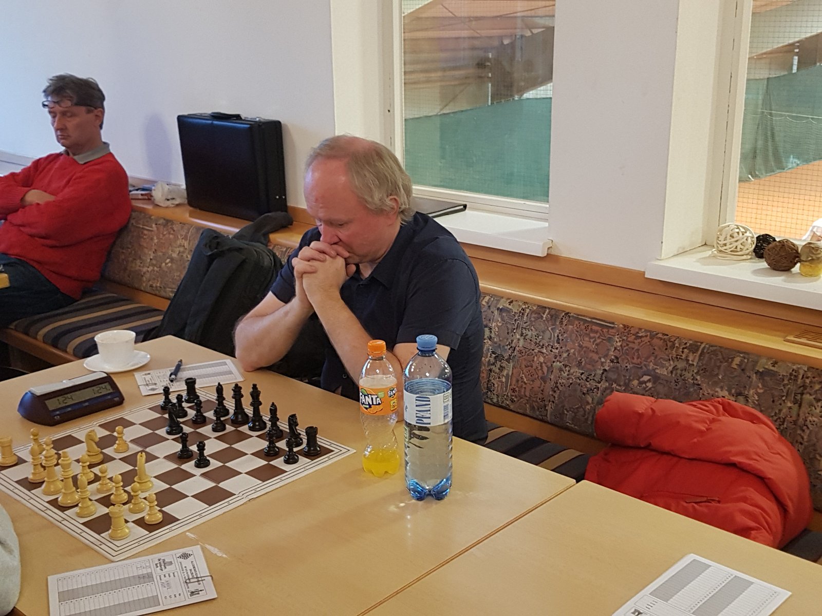 Am 1. Brett hatte Klaus Wiedmann einen Springer auf e5 eingepflanzt, der das Spiel von Christoph Löffler beeinträchtigte, außerdem hatte Christoph bereits einen Bauern geben müssen. Christophs Kommentar „Ich stehe schlecht“ war zutreffend. Mit großem Kampfgeist gelang es ihm, in ein Damenendspiel mit Minusbauer abzuwickeln, in dem er ewiges Schach drohte, worauf die Partie mit remis endete.