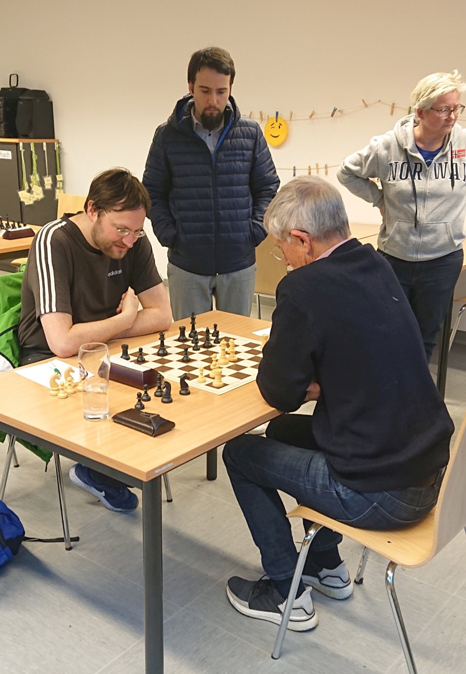 Als ich kurz vor halb sechs Uhr zum Turniergeschehen kam, hatten die Young Star Festspiele schon begonnen: Adil Kücük auf Brett 6 gegen Wolfgang Moßhammer hatte nach einer turbulenten Partie und gegenseitigen Chancen das bessere Ende für sich. Ein Einstand nach Maß!
