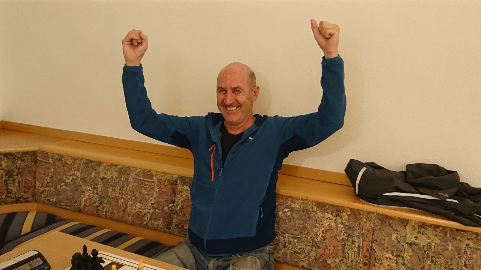 Von diesem offensichtlichen Handicap besonders angespornt, spielte Klaus noch motivierter als sonst. Zuerst bekam er es mit dem hochsoliden Anatol Lederer zu tun, der zum Siegen verdammt, keinen Weg durch die solide Verteidigung von Klaus fand. Letztlich kam was kommen musste (Zeitnot) und Anatol verlor. Im Finale saß Klaus kein geringerer als der fintenreichen Stefan Heigerer gegenüber. Hier kam Klaus besser aus der Eröffnung und erreichte eine überlegene Stellung. Bis zum Sieg war aber noch ein langer Weg. Ein Versehen in Zeitnot besiegelte dann auch hier das Ende. So rang Klaus in zwei gut 1 ½ stündigen Partien seine Gegner in hartem Kampf nieder, ehe er erleichtert die Arme zum Siegesjubel heben durfte. Herzliche Gratulation zum Sieg!