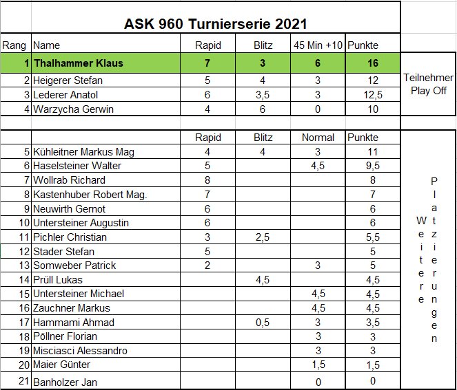 Die übrigen Spieler kämpften um die weiteren Plätze. Turnierleiter Walter Haselsteiner freute sich über insgesamt 14 Teilnehmer, darunter 6, die neu in das Turnier einstiegen. Insgesamt hatten 21 Teilnehmer in der Turnierserie diese ungewohnte Form des Schachspiels ausprobiert.