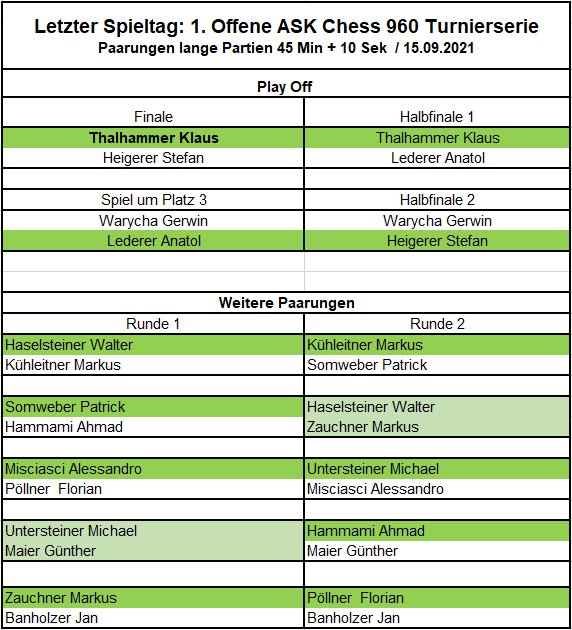 Da bei einem Remis der zuvor besser platzierte aufsteigen bzw. Sieger werden würde, entstanden besonders intensive Partien. Insbesondere wurde damit die schärfste Waffe von Klaus Thalhammer, nämlich im entscheidenden Moment unablehnbare Remisangebote zu machen, stumpf. Er war an der Spitzenposition besser gesetzt, und wusste damit, dass der Gegner ablehnen müsste (Der Vorstand überlegt, wie wir hier für die Zukunft eine Lex „Klaus“ machen könnten).