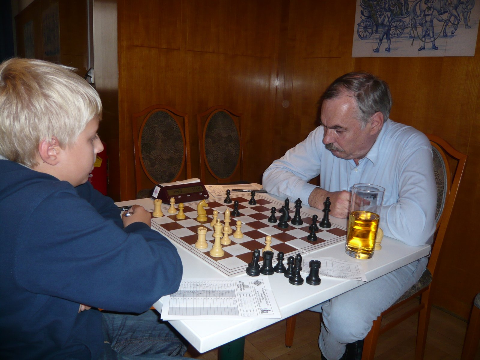 Aber auch er selber spielte natürlich leidenschaftlich Schach, immer hart im Spiel aber fair und generös im Turnier – wie hier 2012 gegen einen der vielen Jugendspieler, auf die er im Laufe seiner „Karriere“ in der 2. Klasse stieß.