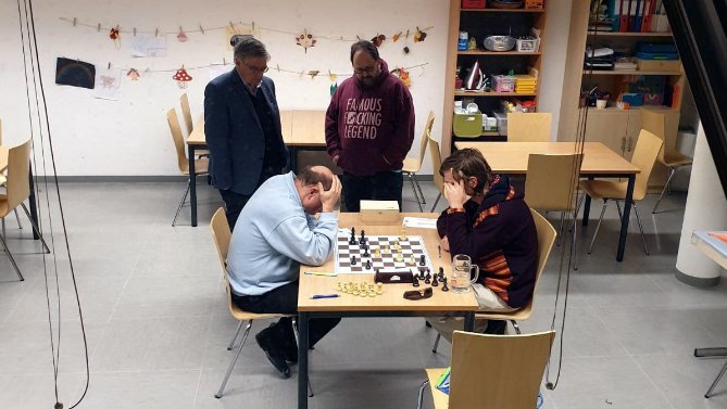 Bernhard (schwarz) spielte mit seinem Gegner eine über weite Strecken ausgeglichene Partie. Allerdings war es bereits klar, dass ein Punkt aus unserer Sicht fast notwendig wäre, da ich schon ziemlich schlecht stand. So spielte Bernhard auf Gewinn. Nach und nach konnte er aber doch mehr Druck aufbauen und den weißen König unter Druck setzen, und schlussendlich die Partie für sich entscheiden.