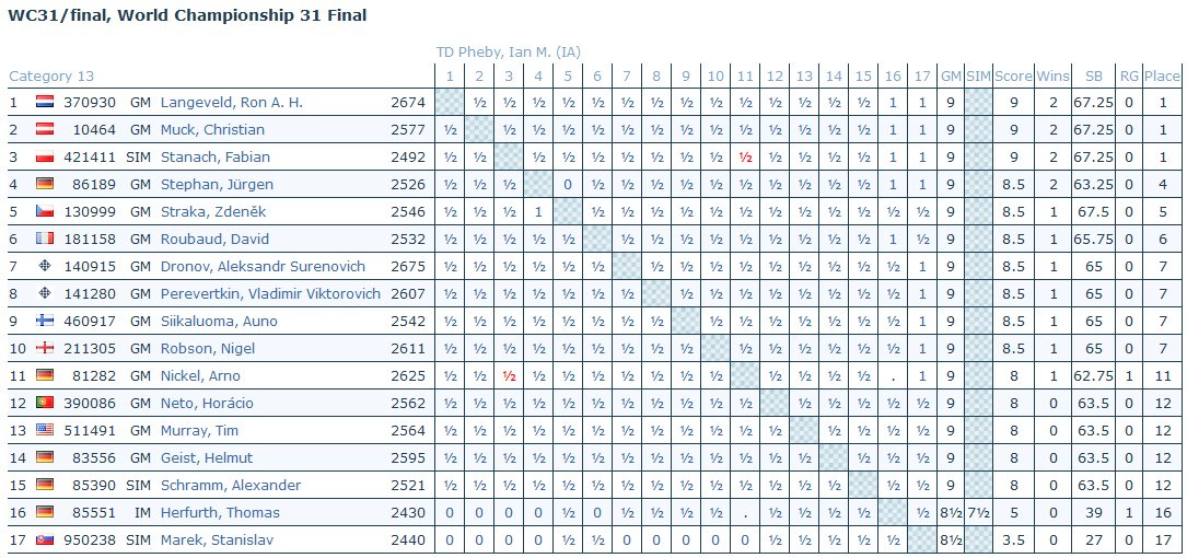 Der Wiener Fernschachgroßmeister Christian Muck hat es geschafft: Nachdem er vor mehr als einem Jahr die Führung in der 31. Fernschachweltmeisterschaft übernommen hatte, musste er geduldig warten, ob es einem Teilnehmer noch gelingt, ihn ein- oder sogar zu überholen. Das Turnier ist noch nicht beendet, aber es steht bereits seit wenigen Tagen fest, dass sich GM Muck den Titel des Fernschach Weltmeisters mit dem niederländischen GM Ron Langeveld und dem polnischen SIM Fabian Stanach teilt. Der deutsche GM Arno Nickel kann mit einem Sieg in der letzten noch laufenden Partie aufschließen.
