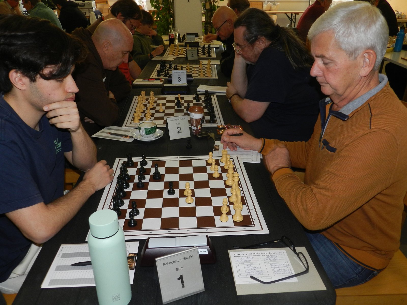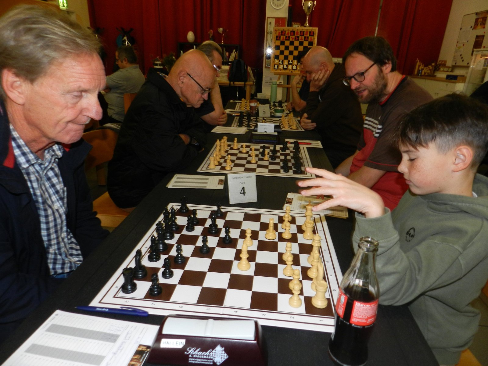 Auf Brett 3 trafen Valentin Rossiwall und Karl Koller aufeinander und wählten ebenfalls einen spanischen Aufbau. Nach einem unorthodoxen Zug des weißen Königs nach e2 brauchte Karl nicht lange, um das Matt im 9.(!) Zug zu finden. Dies stellt sicher ein Highlight in der nicht ganz jungen Karriere von Karl dar.